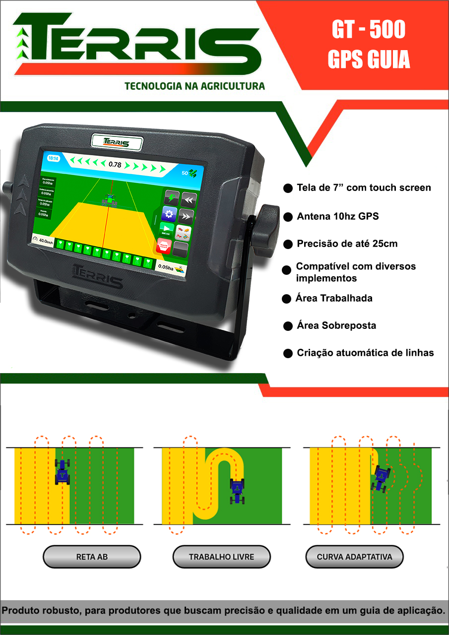 Robusto, o GPS GT-500 é ideal para produtores que buscam precisão e qualidade em um guia de aplicação.